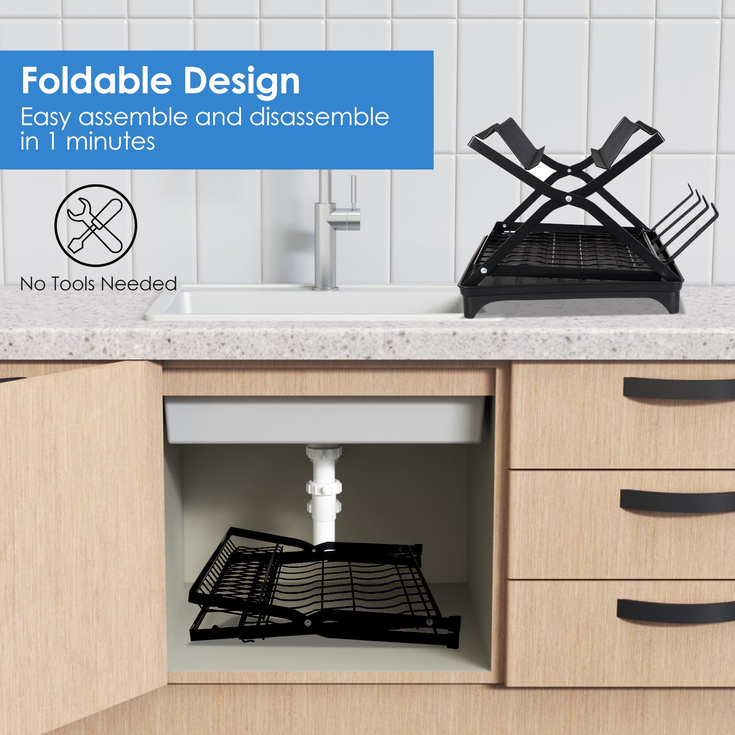 Home > 2 Tier Dish Drying Rack with Cup Holder Foldable Dish Drainer Shelf for Kitchen Countertop Rustproof Utensil Holder with Drainboard Black