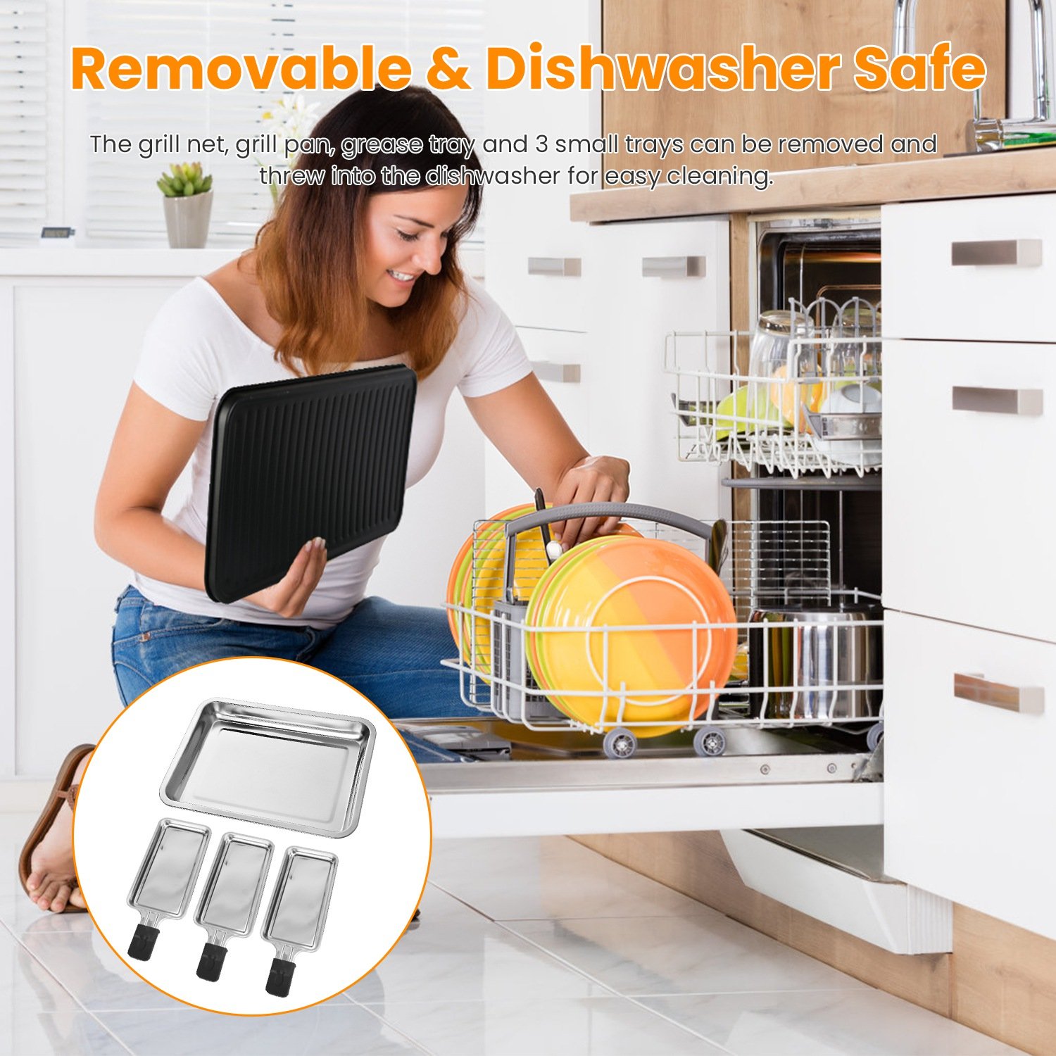 Do you enjoy BBQ with your family or friends in special holidays? Our 2-in-1 electric grill with grill net and plate allows you to cook/fry/bake/grill delicious food like chicken, succulent beef, prawns, flavorful fish, and finely chopped vegetables and so on. You can cook your food on the plate and 3 small trays below or just use grill net to grill the food you like. 5 Heating temperature adjustment can easily meet your daily cooking needs for optimal results of various foods. The plate, grill net, grease tray and 3Pcs small trays can be removed and threw into the dishwasher for easy and quick cleaning. Ideal for small families, couples, and individuals living alone to have meals together.
